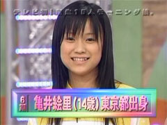 「東京都出身の亀井絵里です。最近はもんじゃにはまっています。特にめんたいチーズ餅もんじゃが大好きです。」