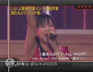 マジヲタがマジに語ると長いぞシリーズ第二弾。 マジヲタがマジに娘。について語ると↓なります。 二日連続ですがよろしくお付き合いください。 ちょうど一年前。 僕は横浜アリーナで泣いていました。 安倍なつみがモーニング娘。を卒業した日でした。 今から約七年ほど前の話。 僕はASAYANを毎週欠かさず見ていました。 娘。結成前から「安倍ちゃん(懐かしい呼び方だ)」のファンでした。 ASAYAN・ナイナイ推しだったので、その流れで池脇千鶴・鈴木あみも推していました。(マテ) ケミストリーのオーディションのときはネスミス推しでした。(笑) なっちを一推しだった時代は三年ぐらい続きましたが、その間はグループとしてのモーニング娘。に興味を抱いてはいませんでした。四期が加入したあたりから、モーニング娘。というグループそのもの推しにかわりました。もうあれから七年以上たつんですね〜。長いな〜。 ちょうど一年前の日記でなっちの卒業について語っています。 一部抜粋します。(2004/1/29) そして一番感動、感激したのはオリメン飯田の言葉。なっちを味噌汁の味噌と例えています。 辻加護はダシに例えているけど、豆腐やアゲといった具の方がいいかな。 僕がお椀に例えた飯田圭織さんの卒業まであと五日となりました。 みんなかおりんの卒業をどうとらえているのだろう? 「お椀」がなくなるんだよ? 味噌(エース)がいなくても、お椀さえあれば吸い物だろうが、コーンポタージュだろうが、やっていけるのさ。でもお椀がなくなると…。 なぜ僕がかおりんをお椀に例えたか。 それは彼女こそ、モーニング娘。そのものであり、体現者だと思うからです。 モーニング娘。はオーディションに落ちた落選組のサクセスストーリーなわけですが、 よく考えれば二期以降はオーディションの合格組なのです。 なっちは落選組だったとはいえ、ロックボーカリストオーディションでは「即キープ」でいきなりの最終オーディションだった し、娘。結成後もセンターにたち続けました。 モーニングコーヒーは元々メインで唄う予定だったのはかおりん。 しかし一夜でコーラスにまわることになってしまいました。 (「昨日に戻りたい」は名言) タンポポというユニットのリーダーになるものの、なかなかオリコン一位がとれず、あとから出来たプッチモニ。、ミニモニ。に先を越されてしまったり。 それでも、頑張って、必死になって、タンポポは「王子様と雪の夜」(かおりんのいるタンポポ最後の曲)でオリコン一位を獲得できました。 娘。イズム(魂)とは?と考えたとき、僕はかおりんをまず頭に思い描く。 そんなモーニング娘。の体現者であるかおりんが五日後卒業する。 もっとみんなこのことを重く受け止めてほしい。 現娘。のメンバーたちはかおりんから「魂」を継承できたのだろうか? 矢口・よっすぃーは別の形のお碗(お皿)になれるのだろうか? 五期、六期のメンバーは具になれているのだろうか? あとは料理の鉄人、つんく氏の腕の見せ所といったところ。 | ||
