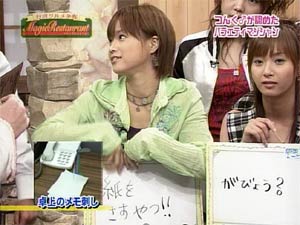 モーニング娘。は現在何人か知っていますか? と一応聞いてみた(笑) モーニング娘。は現在10人です。 5→8→7→8→7→11→10→9→13→12→16→15→14→12→11→10→11→10という変遷を経て、現在10人です。もちろん知ってますよね? この10人のメンバー使って、何かに例えてみよう・・・というのは、今も昔もよくやる話。例えば、娘。でサッカーチームを作ったら?、野球チームを作ったら?など。 各メンバーの性格や特徴を把握しつつ、ポジションなどを考えていくのは結構楽しい。そんなことをしたことないですか? これから二週に渡って、こんな馬鹿なことをしてみます。 まず、第一週のテーマは”干支” 子、丑、寅、卯、辰、巳、午、未、申、酉、戌、亥。 (ね、うし、とら、う、たつ、み、うま、ひつじ、さる、とり、いぬ、い) 娘。さんたちは10名なので、2つ余っちゃうけど、そんなことは無視して当てはめてみましょう!誰がどれに合ってそうですか? さあ、みんなで考えよう!(by逸見) こういうのは、わかりやすいところから埋めていった方がいいな。 考えるまでもなく決まるのが、さゆの「卯」(うさぎ)かな。(うさちゃんピース) 次に決まるのが、愛ちゃんの「申」(さる)かな。(モノマネ) 「丑」(うし)は難しいですよね。お肉大好きなれいなかミキティかどっちにしようか悩むところですが、ここは敢えて二人をはずしてまこっちゃんかな。 (まこっちゃんの写真集に牛の着ぐるみを着たものがあります。) と考えていって、埋まったのがこれ。 子(ねずみ)…ガキさん 丑(うし)…まこっちゃん 寅(とら)…みきてぃ 卯(うさぎ)…さゆみん 辰(たつ)… 巳(へび)…小春ちゃん 午(うま)…えりりん 未(ひつじ)…紺ちゃん 申(さる)…愛ちゃん 酉(とり)… 戌(いぬ)…れいな 亥(いのしし)…よっすぃ それぞれ理由がきちんとあります。どういう理由かわかりますか?? 例えば、よっすぃ。ガッダスの試合をご覧になったことがある方はわかりますが、よっすぃのドリブルは力強くて、まるで日向小次郎のように直線的なドリブルなんですよね。 その姿を四字熟語にすると「猪突猛進」がぴったり! というわけで「いのしし」です。(笑) このように理由があるので、他のメンバーの分も考えてみてください。 来週は、「モーニング娘。で内閣を作るなら??」 を考えてみます。 11/2は内閣改造、第三次小泉内閣のスタートですよぉ〜 みなさんも暇なときに考えてみてください。 それにしても、なんで亀年ってないんだろう??? なんでえりりんは午(うま)なんだろう・・・説明していないや。 |
