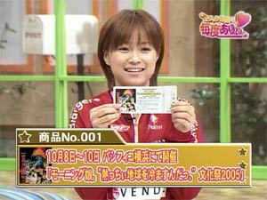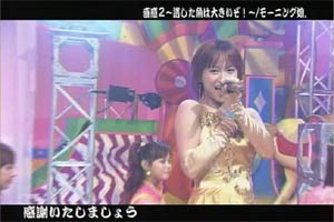 文化祭レポいっちゃうよぉぉぉ!〜エコエコォォ〜〜!!〜 さて、レポを書くか・・・といっても何も書くことがない。。。(汗) いくつかの企業が出展していたのですが、何も見ていないんです。(更汗) フードコートと、グッズ売り場と、メインステージを移動していただけ。(滝汗) さあ、そんな僕にどんなレポを書けと???(笑) メインステージでは1日三回、劇、クイズ、マジックショーが行われました。 全部で二時間ほど。その二時間の間に46人のハロプロメンバーが出演するんです。 えりりんの登場シーンがどれだけあったかというと・・・(悲) 娘。とエコモニ。がメインだったので、他のメンバーよりも出演している時間が長いとはいえ、それでも物足りない。 そんな中から印象深かったことをレポレポォォ〜〜! メインステージのイベントのメインは娘。メンバーによる劇とHELPの披露。 劇はエコを訴えるためのものであったためか、説明的なセリフばかり。 そんな堅苦しい劇をおもしろくしたのは、脚本かな。 かなり攻めている脚本でした。 モーニング学園という学校が舞台で、えりりんは学校の先生役。その学校を退学した「矢口」さんという生徒がいたらしい。 男女交際のため、学校を退学して、横浜駅の近くの飲み屋で働いていたところを不動産屋さんのお金持ちと知り合い、結婚してロシアに住んでいるらしい。 (住みにくい日本を)脱出した「矢口」さんを「勝ち組」と言うのはミキティ。 おいおい・・・・そんなこと言っていいのか?? かなり攻め攻めの脚本だな・・・ 「最近の矢口さんのテレビ出演量を考えると。。。」 ってリアルと照らし合わせてしまった僕っていったい・・・。 これ以外にも紺ちゃんが写真集の「なつふく」をさりげなく宣伝したり、細かい部分でよくできていた脚本だったと思います。 劇そのものは、難しい言葉や、環境に関する数字が多く含まれたセリフばかりで、しかもその一つ一つがとても長く、 よく覚えたなぁ〜と感心しました。 どこかにカンペでもあるのでは??と思い探しちゃったぐらいです。(笑) カンペがないことがわかると、「事前にセリフを録音しておいて、口パクなんじゃないの?」と思ったぐらいですから、相当頑張ったんだと思います。 セリフの内容を聞いて「環境問題を考えねば!」と思うよりも、セリフを言っているときの姿を見て、「頑張れ〜」って思ってしまうところはファンの悲しい性です。 えりりんがとちらないかセリフを噛まないか、注意して聴いていましたが、僕が聴いている限り一度もそんな失敗がありませんでした。 セリフを噛んでしまうえりりんを少し期待していただけに残念(マテ いや〜〜えりりんは完璧でしたよぉぉぉ 劇が終わるとHELPを唄います。一番は六期三人がメインで、二番は梨華ちゃんが加わりエコモニ。がメイン。また、2日目(9日)の三回目の公演では、梨華ちゃんがDEF.DIVAの公録のため抜け、その代役を えりりんがすることに!!その三回目公演では、HELPだけでなく、その後のクイズコーナーでも梨華ちゃんの代役を務めました。 代役といってもエコモニ。の衣装は着ていませんでしたが。。。(残念) そこで思ったのは、さゆえりコンビのあうんの呼吸。 アイコンタクトとかってよくいいますけど、彼女らはそれすら必要ないね。 あうんの呼吸というか、ツーカーというか、山と言えば川というか。 えりりんと言えばさゆみん。さゆみんと言えばえりりん。 さゆみんにジェラシーを感じることすら諦めたくなるぐらいの仲のよさ。 さゆえり最強!!を改めて認識させられました。 ハロプロ最強のコンビである辻加護を超えることができると期待しています。 フードコートでは、いろんなものが売っていました。 結構いい値段していましたが、各メンバーの写真にメッセージ付きでオススメ商品になっていて、多くのファンがそれに釣られて食していました。 友人の梨華ちゃんファンは、梨華ちゃん命名の「梨華ちゃんカレーうどん」を800円で食べました。 友人のミキティファンは、ミキティ命名の「ミキティ丼」を600円で食べました。 友人のさゆみんファンは、さゆみんおすすめのシュークリーム(350円)を六個も食べました。 友人のガキさんファンは、ゲームでガキさんが食べたカニ(2000円)を食べました。 友人のよっすぃファンは、よっすぃおすすめの天丼(1000円)を食べました。 友人のれいなファンはれいなが食べた梅干し(100円)を食べました。 ↑なぜか彼だけ晒し(爆)(←意味深) みんな必死すぎるよ。 釣られすぎ・・・。主催者の作戦勝ちというか、思うつぼというか。 僕はというと・・・・えっと・・・秘密です。まあそれなりに食べましたぁ! 文化祭で一番印象に残ったのは、小池環境大臣です!(マテ いや〜〜政治ヲタとしてはかなり熱かった! 至近距離で見ましたからぁ! そんな冗談はおいておいて、一番印象深かったのは、なちまりで漫才をしている姿を見ていたえりりんの表情。 手で口元を隠しながら笑っている