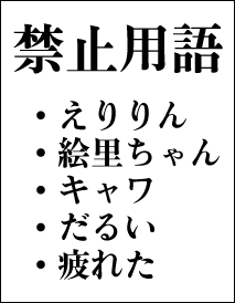 みなさんは自分がモーニング娘。のファンであることを友人や家族、恋人、職場の仲間などに言っていますか? 友人のK君は部屋にBerryz工房のポスターを貼って、親には「モーニング娘。さくら組」だとウソを言っていました。ファンクラブから届く青封筒を家族よりも先にゲットしようと、ポストを日夜チェックしているという友人もいます。 僕は家族、友人、彼女、職場の同僚に伝えています。 「伝えている」という表現はおかしいな。。。 別に伝えようと努めているわけではないですから。。。 ではなぜ、僕の周りは僕が絵里ちゃんファンだと知っているか??? その前にちょっと愚痴を書きます。 最近、職場の仲間たちが僕に冷たくなった。 香港FCツアーから帰国した次の日のこと。 僕は栗の入ったヨウカンとバナナのチョコレートをお土産に出勤しました。 すると、職場のいたるところにビラが貼ってある。 A4サイズのビラで合計10枚ほど。 なんだろう??とそのビラを見ると下記のようなものだった。 ![]() ガー〜〜〜〜〜ン!!! 栗の入ったヨウカンよりも、すっばらしい土産話という名の土産を持ってきたというのに、それを語るなとこのビラは言っているんですよ!! ヒドイ仕打ちだと思いません??? ビラは無視してノロケトークという名の土産話をいっぱいしましたけどね! まだまだ、ヒドイことがあるんです。。。聞いてくださいよ。 最近、「えりりん」って言うとみんな聞こえないフリするんです。 早い話が”無視”ってやつです。 僕が「えりりん」と発言することは、もはや僕が息をしているのと一緒だと言わんばかりに、みんな聞こえないフリするんです。 ひどくないですか??? ここ1ヶ月ぐらいで「えりりん」っていう回数は1/10ぐらいに減りましたよ・・。 たぶん、1日40回〜50回ぐらいしか言っていないです。 さびしぃぃぃぃぃ〜〜〜(ショボーン) これはフィクションではありません。ノンフィクションです!! 話を戻して、 「なぜ、僕の周りは僕が絵里ちゃんファンだと知っているか??」 説明しなくてもわかりますよね・・・・。 そりゃ、気づかないわけないですよね。 顔には「えりりん大好き!」って書いてあるんですから。(キモー |