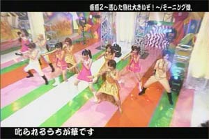 と、ざっとモーチャンを紹介しましたが、テレビジョンを見て気になったのは、モーチャンよりも新曲紹介の記事。 記事に使用されていた画像がこちらの新アーティスト写真でした。 娘。のファンが、歌のパートやメインが誰かだとか、センターは誰かと気になってしまうのは、ASAYANの影響だと思うのですが、ASAYANが終わってから何年も経つのに未だに気になってしまうのは、 体に染みついてしまったもののようです。特にこういうひな壇は、いろいろ語りたくなってくる。自分の推しメンバーがいい位置だとすっごく嬉しいし、その逆だとすごく凹む。 こんなことに一喜一憂するのはどうなんだろう?と思うんですけどね。。 僕のように一喜一憂している娘。ファンって少なくないと思います。 この画像を肴にして、娘。ファンの友人と酒を飲むと一晩はいけますよね。 語りたいことはあるが・・・まあそれは次回。 | |||