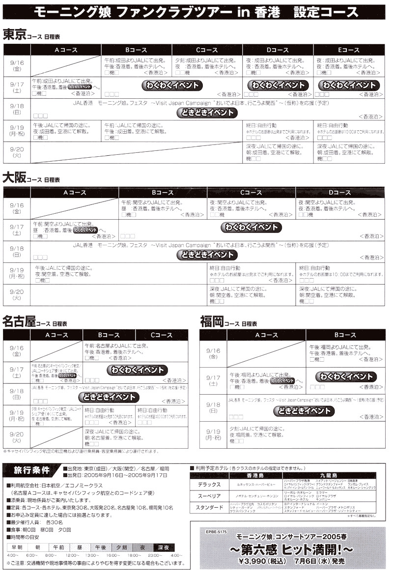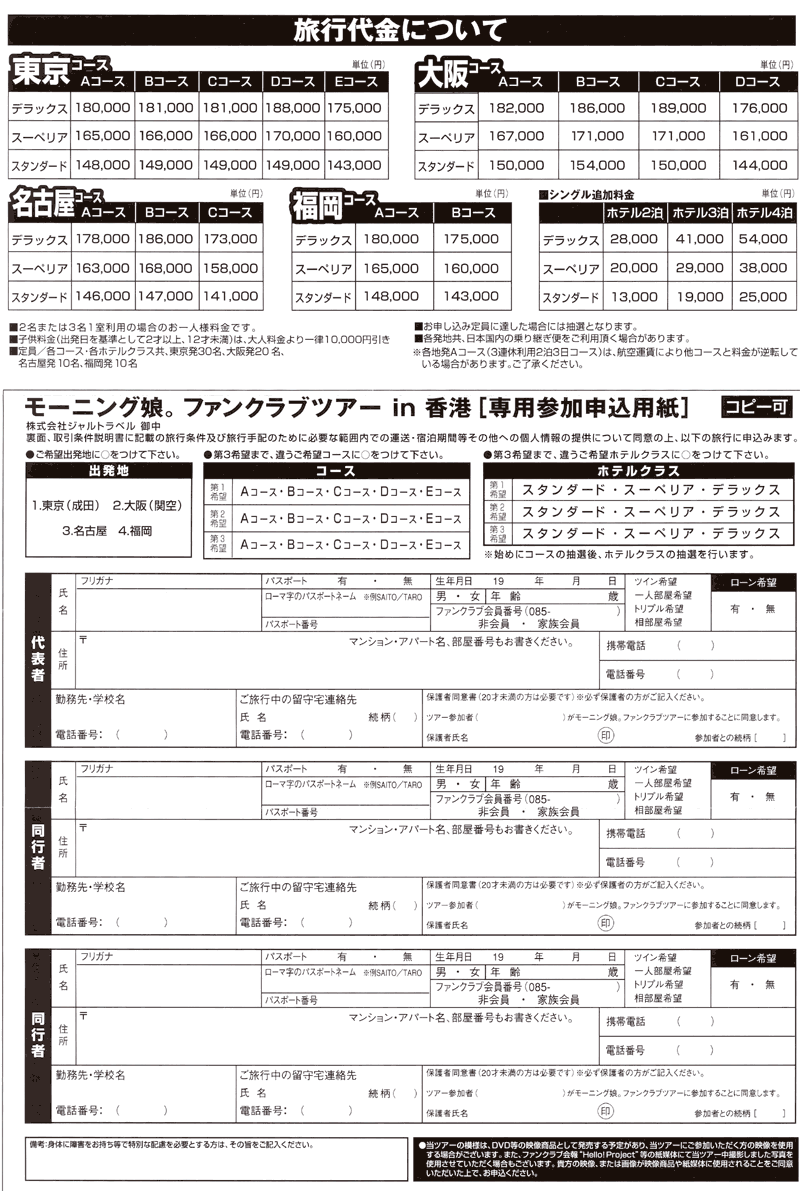 僕はというと…心の中で一つの結論を出していますが、まだ公にはしないでおきます。周りの動向を見て、ぎりぎりまで悩みたいと思います。 「香港に行きたいけど…〇〇が不安」という方に参考になるかどうかわかりませんが少しアドバイス。 ■一緒に行く人がいなくて、一人じゃ不安なんですが… 去年のハワイツアーは、ほとんどの方がピン参戦だったようです。グループで申し込んでいる人はほんの一握り。みんなそういう不安を持っているので、空港だとか、バスの中で早めに話し掛けて友達を作ってしまえばよいと思います。話をしだせば「同好の士」ですからすぐに仲良くなれますよ、きっと。僕がツアーに参加することなったら、えりこむ主催で香港オフ会でもしましょうか?(笑) ■中国の反日感情が怖いのですが… 小泉さんにみんなで、「靖国神社への参拝は9月20日まで自粛してください。」とお願いしましょう。なんならみんなで靖国神社に行って祈願したほうがいいかな。(笑) ■休みがとれないのですが… そっそれを僕に相談されても…。申し込むだけ申し込んでおいて、直前に「親戚の不幸」とでもいって休むのはどうですか?まぁ一番いいのは、これを機会に家族、友人、職場に娘。ファンであることをカミングアウトして堂々と休みをとる。必死なところ見せれば休みもらえますよ、たぶん。僕なんか、僕に関係している人、全員に知られていますよ。一般の友人には最近名前で呼ばれたことがなく、「えりりん」って呼ばれているぐらいです(笑)。 ■お金がないのですが… 僕もないので、これにはアドバイスするのは難しいなあ。なんとか頑張りましょう! ■パスポートの取得ってどれぐらいかかるんですか? こちらを参考に。五年のパスポートで10000円。 10年のもので15000円のようですね。申請から受領までは一週間ほどのようです。官製ハガキ一枚、証明写真を一枚忘れずに。今まで必要だった住民票はほとんどの地域で必要なくなったようです。 ■香港って飯うまいの? 中国に返還される前に一度行きましたが、本場の味はなかなか日本人の舌には…。まあマックや吉野家もあるから大丈夫でしょう(笑)。 ■中国語がしゃべれないんですが… 1997年まで英国の植民地だったので、英語がばりばり通じます。安心してください。 ■英語もしゃべれないのですが… 大丈夫。身振り手振りでどうにかなりますよ(笑)。海外旅行は度胸が大事。ビビルことはありません。 ■握手会のとき何を言ったらいいかわからないんですが… そんなもん、俺に聞くな!俺だってわからんわい!いや、まじで。考えて、考えて、考え抜いて、事前にシミュレーションしても、一人目と握手した瞬間に頭が真っ白になり、せっかく考えたことが意味をなさないことを覚悟してください。 ■どのコースにしたらいいのかわかりません。 僕もわかりません。 ■どのホテルランクにしたらいいかわかりません。 ハワイならスーペリア(真ん中のクラス)がお薦めですが、香港はわかりません。どうしましょうか?(笑)デラックスなら落選はないという噂がありますが…。 ■香港でflightさんに会いたいのですが… 僕が行くかどうかまだ未定。 行くことになったら、「香港ツアーを楽しもうぜ!」(亀井じゃなく仮名)という特設サイトを僕の友人が用意してくれる予定です。そこで事前交流、スケジュール調整をして、香港ではみんなで飯でも食べましょう。日本でやるように、100人規模はさすがにきついですが。 参考になりましたか? 最後に、去年のハワイツアーで一番楽しかったことを記しておきます。 それは握手会イベント前日のホテルの部屋での、友人とのトーク。(爆) 異常にテンションが高く、抱腹絶倒、ワイキキの歓喜といったところでした。 いや〜まじで楽しかったです。 あのテンションを味わいに、香港に行きたいなぁ〜。 |