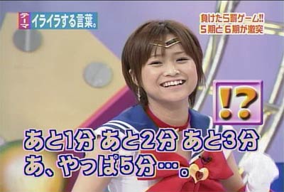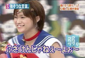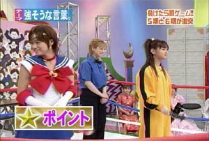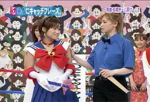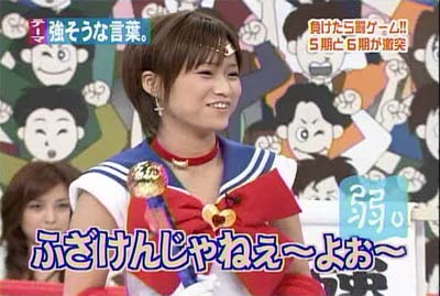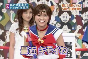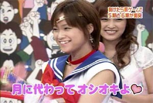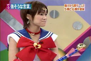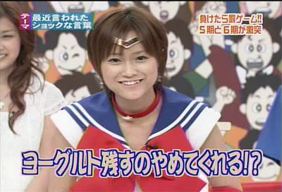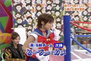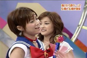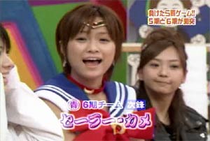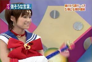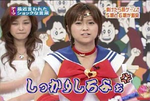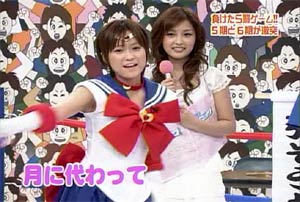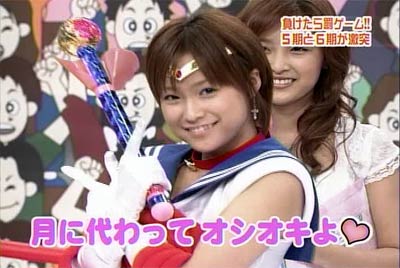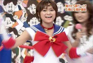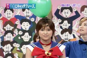 僕がセーラームーンについて知っている知識。 ・10年ほど前、ブームを巻き起こしたこと。 ・主人公の名前が「月野うさぎ」であること。 ・「月にかわって…」という決めセリフがあること。 ・作者の武内直子さんは、冨樫義博さんと結婚したこと。 ・冨樫さんは結婚後、ちょっと(かなり)手を抜いて描くようになったこと。 (※冨樫義博…幽遊白書、HUNTER×HUNTERの作者) 「武内直子」「幽遊白書」の漢字が間違っていました。申し訳ありません。 (6/12 19:00修正) 僕はセーラームーンをよく知らないのに楽しめるのか? そんな不安を抱きつつ、ハロモニ。をPCの前で正座して見た。 そんな不安は、杞憂に終わった。 いや、始めからそんな不安などなかったのだ。 不安だったのは、あまりにもえりりんがキャワすぎて、悶絶、失神し、最後までハロモニ。を見ることができないかもしれないこと。 約30分ほどの時間を僕は必死に耐え、悶え苦しみながらも戦いぬいた! その苦しさをわかりやすく説明するなら、 「約30分間、息を止めていろ!」というものと同じこと。 途中、CMが入るとはいえ、大げさでなく生きるか死ぬか命を賭けた死闘。僕はほとんど呼吸をしなかった。 呼吸なんかしている暇がない! いや、暇がないんじゃなくて、できるかよ!! 危うく窒息死するところだったよ・・・。 僕は勝ったのだ! 途中、何度も意識が飛びそうになった。 そのたびにえりりんが優しく僕に呼び掛ける。 「月にかわってお仕置きよ!」 こんな可愛らしいお仕置きなんて…お仕置きでもなんでもない! 「あの・・・前置きはいいので・・・早く見せてください」 よし!いくぞ、いくぞ! お前ら、心の準備は良いか? 深呼吸しろ!(心臓に悪い方はお控え下さい。) 今日はキャプ画祭りだ!!!!