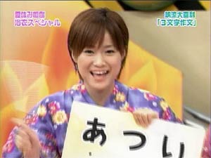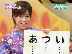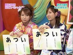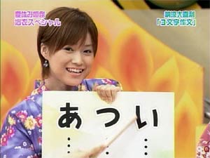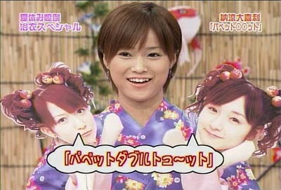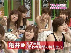 Hello! Project 2005 夏の歌謡ショーのツアーグッズが発表されましたね。 これを見て、「なんじゃこりゃ〜〜」だとか、「ひどい!!」だといったリアクションはしません。 47枚セットだろうが、なんだろうがかかってこい! こっちにはな、強力なネットワークがあるんだよ!! というわけで、昨晩はハロプロ総勢47名の、それぞれのファンの友人に声をかけていました。38名分集まったので、38人割で共同買いする予定です。 持つべきものは友だね。。よろしく!! さて、本題はそんなことではない! もっとおもしろいネタで攻めよう・・・。 これからの日記を読むには、さきほどのツアーグッズを見てください。 ツアーグッズのページと照らし合わせて見ながら、日記を読むと楽しいです。 題して・・・・ 「えりりんを探せ〜!」 まずは初級編。 ■8番、15番、20番、27番、28番の中からえりりんを探して! これは比較的簡単です。続いて、中級編。 ■25番、26番、31番の中からえりりんを探して! 分からなければ、衣装で考えてみて下さい。続いて、上級編。 ■1番、2番、4番、14番、16番、21〜24番の中からえりりんを探して! 上級編と言っておきながら、それほど難しくはありません。 ちなみに、僕はどれもすぐわかりました(汗 わかったといってもえりりんだけですけど。 さて、ここからが本番。 えりりんは一人だけずば抜けてかわいいからすぐにわかるが、 では、他のメンバーは?? 昨晩、友人と必死に考えましたよ。 特に31番。これはなかなかの強敵でした。 それでも正解率70%ぐらいはある自信あります。(どんな自信だよ。 これはかなりの暇つぶしになります。 えりりん以外も探してみてください。 それにしても、とんでもないグッズ出すよな・・・47枚セットっていったい・・・ |