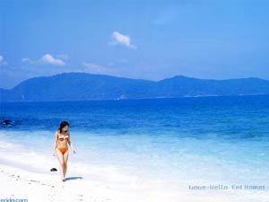 ![]() いや〜すごくきれいですね、海が。白い砂浜、青い海、碧い空、プーケットの美しさがよくわかるショットですが、その景色の美しさにどれだけの人が気づいたことでしょう。 砂浜を歩くえりりんがあまりにもきれいなので、たいていの人は景色の美しさになかなか目がいかず気づかないだろうと思い、「景色もきれいですよ」と皆さんに教えてあげようと冒頭の書き出しをしてみました。僕が景色の美しさに気づいたのはこのショットの壁紙を作り始めて二時間後でしたから。(笑) このショットを見たときある懐かしい歌が僕の頭をよぎりました。「潮風を頬にうけ裸足で駆けてく〜振り向けば白い砂私の足跡〜♪」 というわけでこのショットを命名すると「南の島のエリー」(笑) ラブハロ!亀井絵里写真集inプーケット壁紙第一弾を公開。 ![]()